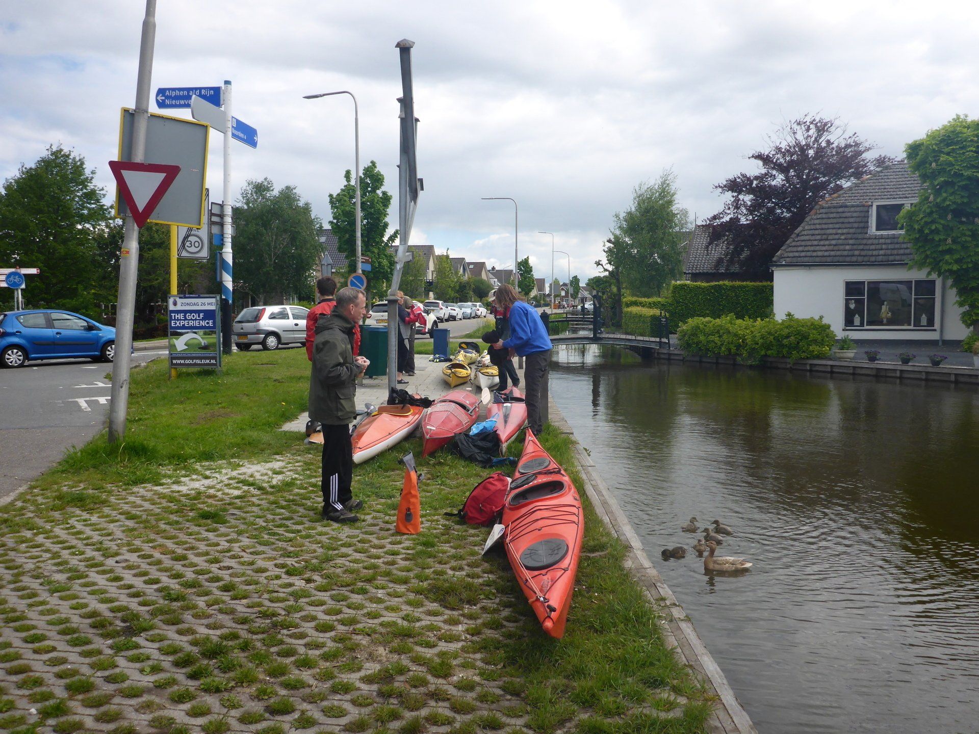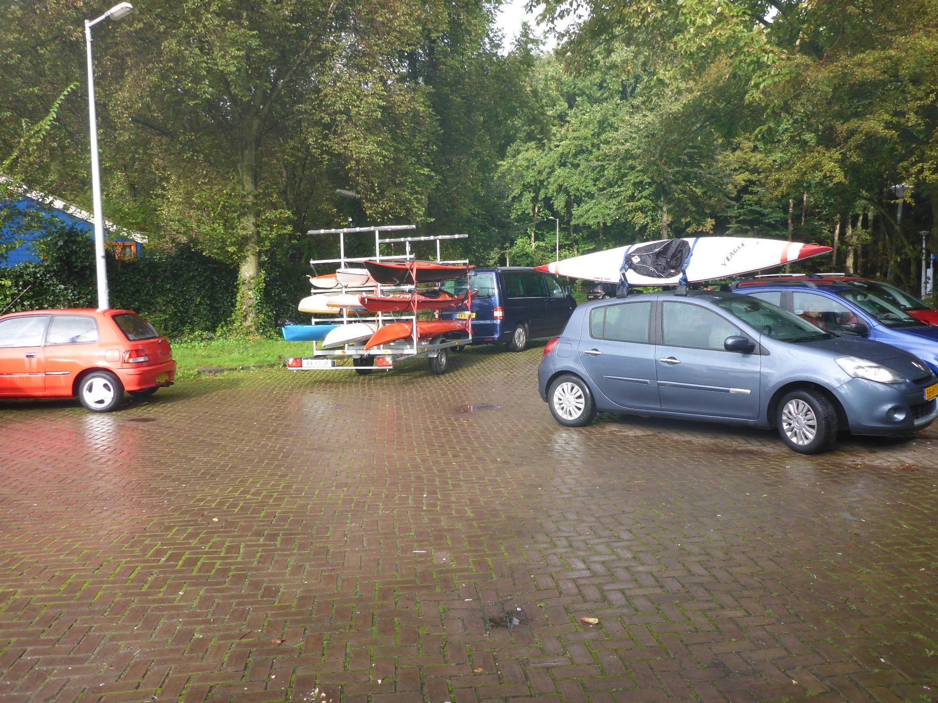 An einem verregneten Sonntagmorgen kommen wir an der Christoffel Plantijngracht vorbei und schlendern über das Gelände. Neue Mitglieder suchen Boote, Paddel und Spraysegel zum Ausleihen. Veteranen holen ihre regulären Habseligkeiten aus dem Lagerhaus und bereiten alles für die Abreise vor. Dreizehn Boote werden schließlich auf den Anhänger und das Dach von Martins Auto gehoben. Wir können losfahren!
