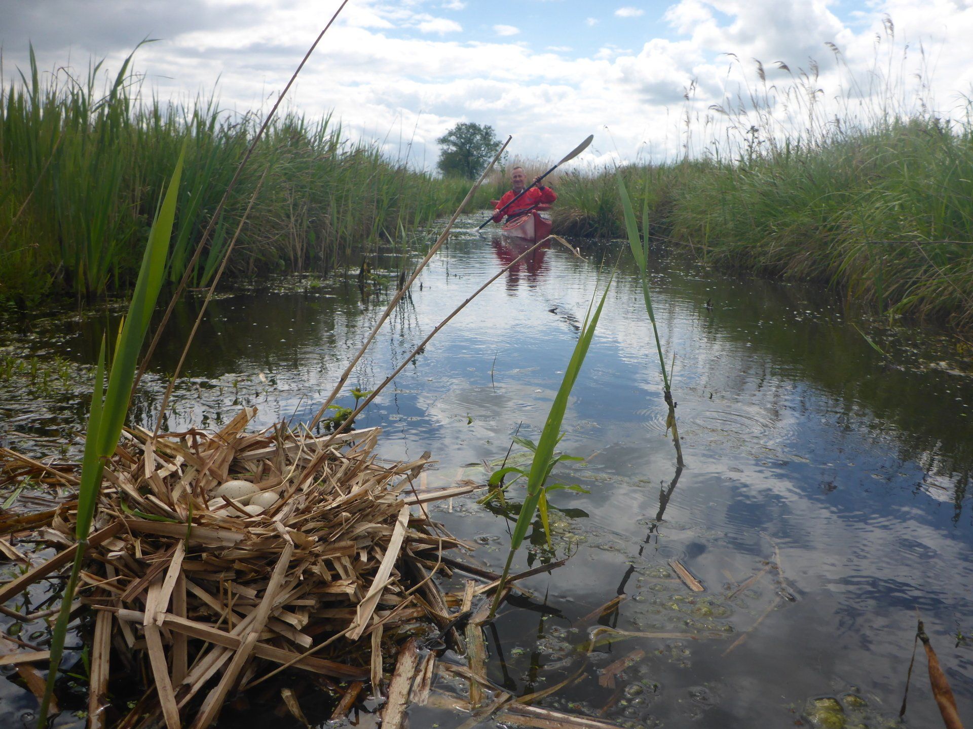 Martin lijkt als toerleider overal te vinden en Koen komt af en toe voorbij met gebruik van bijna iedere kano-houding die voorstelbaar is, zijn kajak hangt af en toe vervaarlijk schuin in het water. We varen rustig verder tot onze tweede stop, midden in de natuur, waar we de veenbodem van dit gebied goed kunnen voelen. We eten onze maaltijd en stroopwafels van Jaap op een verende vloer waar je voeten zachtjes wegzakken in een klein laagje water.