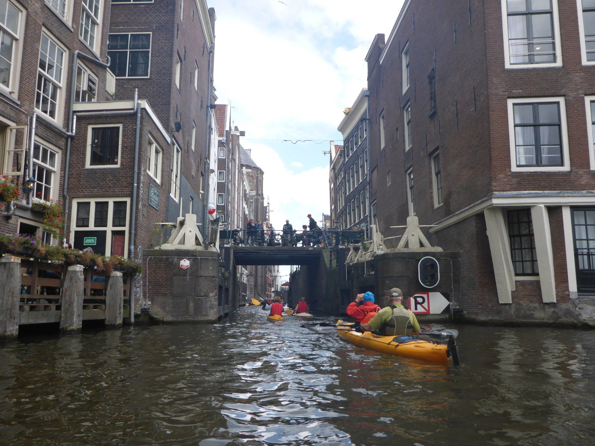 Verderop passeren we werf 't Kromhout met de karakteristieke stalen bogen die in 1887 werden opgebouwd, leuk trivial pursuit weetje: de bogen werden daarvoor gebruikt voor de Wereldtentoonstelling van 1883 op het Museumplein. Uit de andere richting ineens ook kano's, een vereniging uit Deventer die ook de grachten hebben opgezocht.