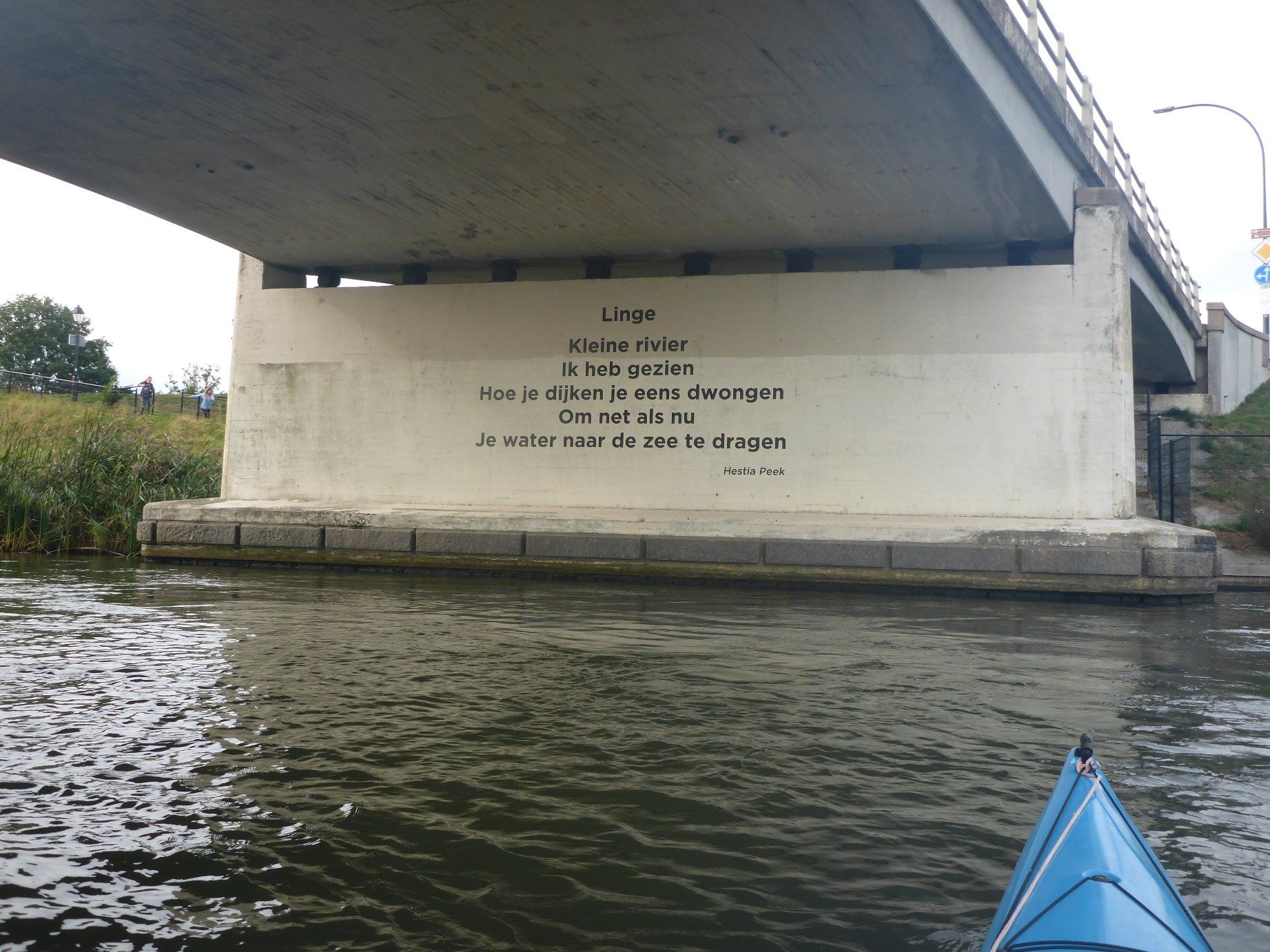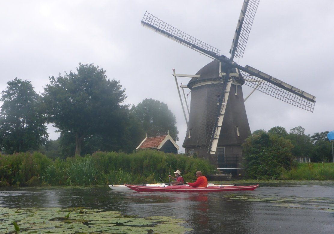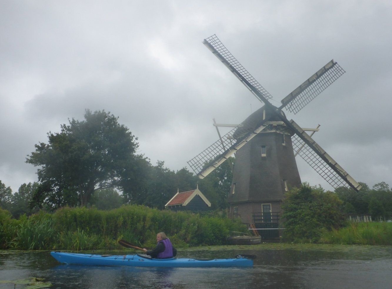 Iedereen de boot in. We starten de route over de rivier Meije met langs de kant boerenland, koeien, schapen en de huizen van het gelijknamige lintdorp. Langzaam komt de watertoren 'Het Potlood' in zicht. Bij een wel erg lage draaibrug stapt Martin soepel uit zijn kajak om de brug te bedienen en verliest daarbij zijn telefoon. iPhone te water! De bodem is liggend op de kant gelukkig net bereikbaar en na wat andere interessante vondsten komt de telefoon boven water. En werkt zelfs nog. We kunnen de tocht dus zonder schade vervolgen.