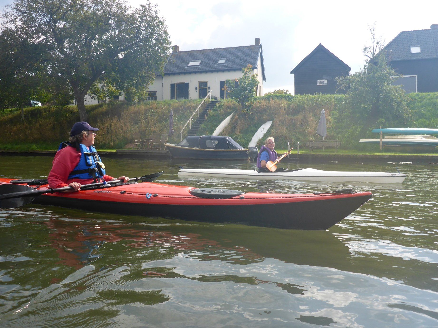 Zondag 26 juni staken we met 12 leden en 1 gast de Plas over, op weg naar de Tuinen van West. Het was zacht weer, het water wiegend. Soepel voeren we naar de steiger aan het Ma Braunpad. Hier droegen we onze schepen over het fietspad naar het licht verscholen steigertje aan de overkant. Het gerenoveerde steigertje gaf goed toegang tot het water in de Binnenpolder. Het water boven het veen borrelde her en der. De dames slaakten gilletjes “Ajakkes!”, want de schone schepen en de peddels raakten besmeurd door de modder die vlak onder de waterspiegel grijnzend op ons lag te wachten om zich vrolijk vast te grijpen. Mijn aanvankelijk grijswitte nieuwe Freestyle veranderde rap