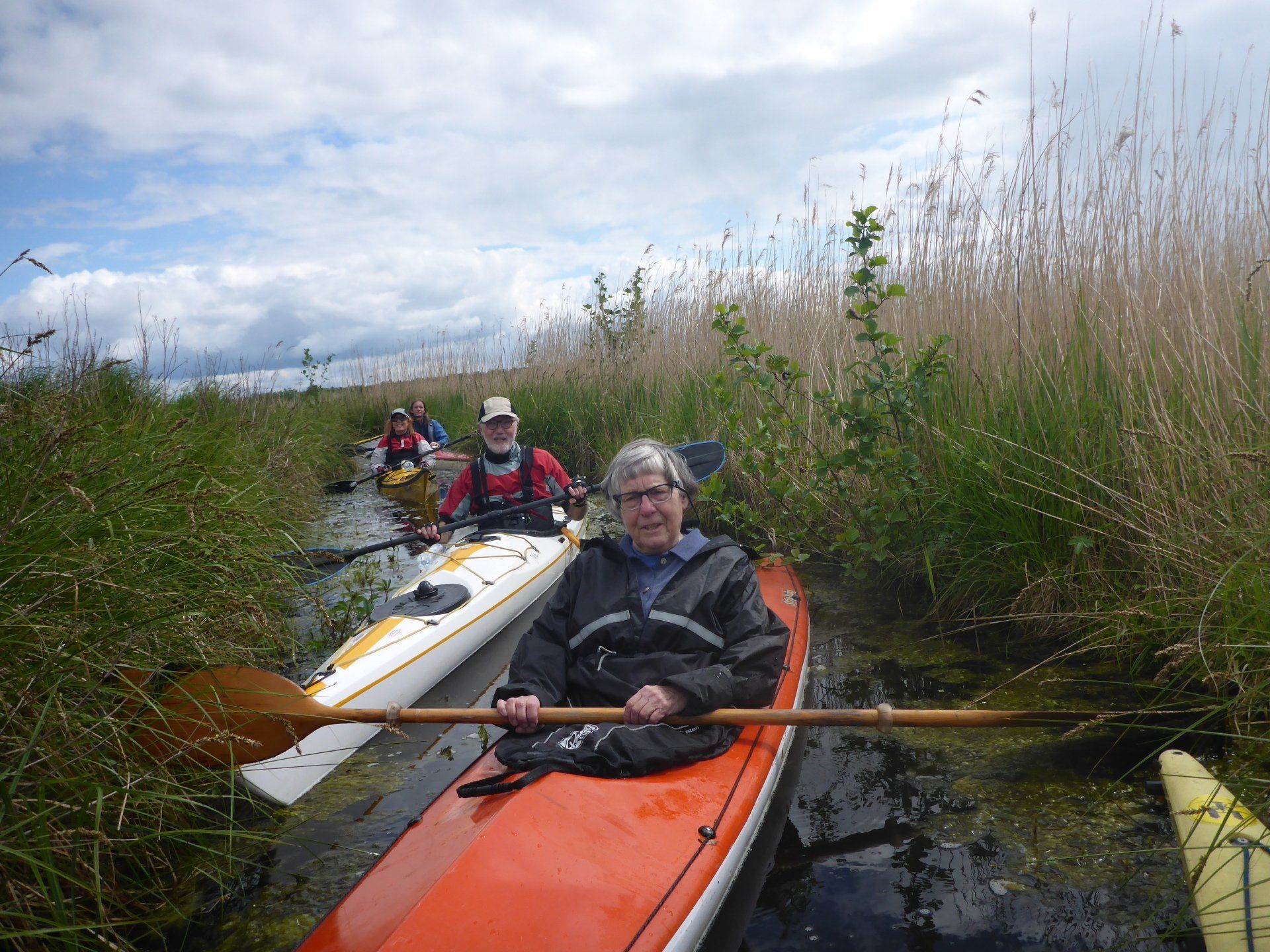 On Sunday, June 26, we crossed the Lake with 12 members and 1 guest on our way to the Gardens of West. The weather was mild, the water rocking. We sailed smoothly to the jetty on the Ma Braunpad. Here we carried our ships along the cycle path to the slightly hidden jetty on the other side. The renovated jetty provided good access to the water in the Binnenpolder. The water above the peat bubbled here and there. The ladies shouted “Ajakkes!”, because the clean ships and the paddles became smeared by the mud that was just below the water surface. was grinning and waiting for us to happily grab hold. My initially grey-white new Freestyle changed rapidly