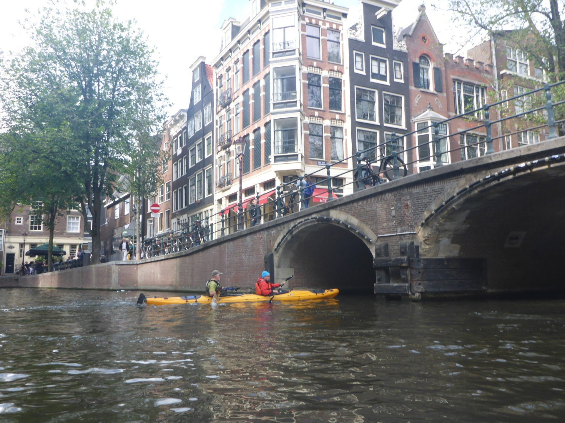 Further on we pass the 't Kromhout shipyard with the characteristic steel arches that were built in 1887, a nice trivial pursuit fact: the arches were used for the 1883 World Exhibition on Museumplein. Suddenly canoes came from the other direction, an association from Deventer that also visited the canals.