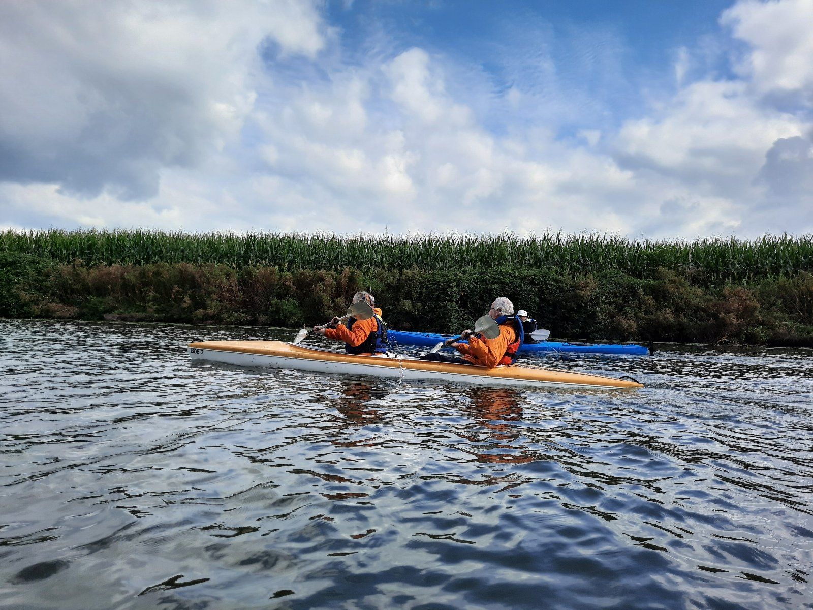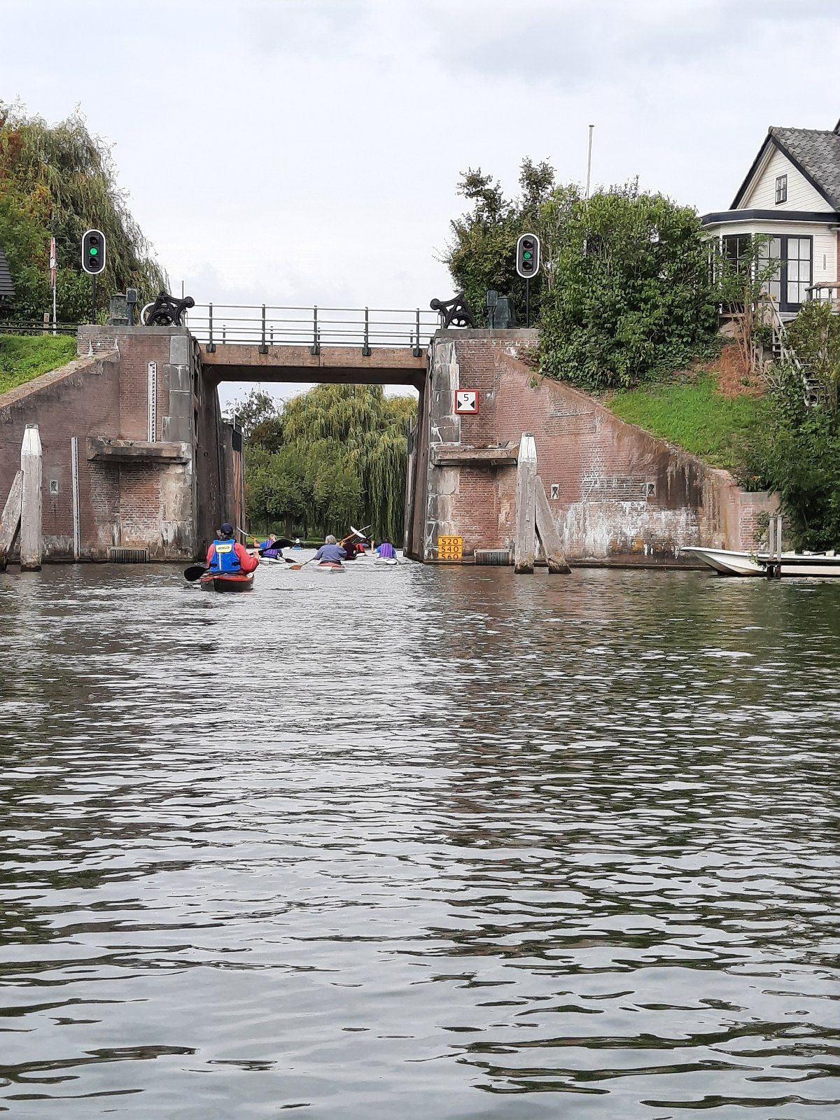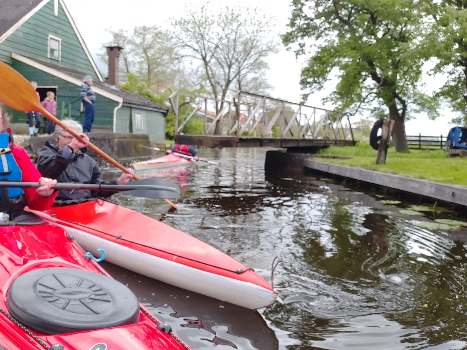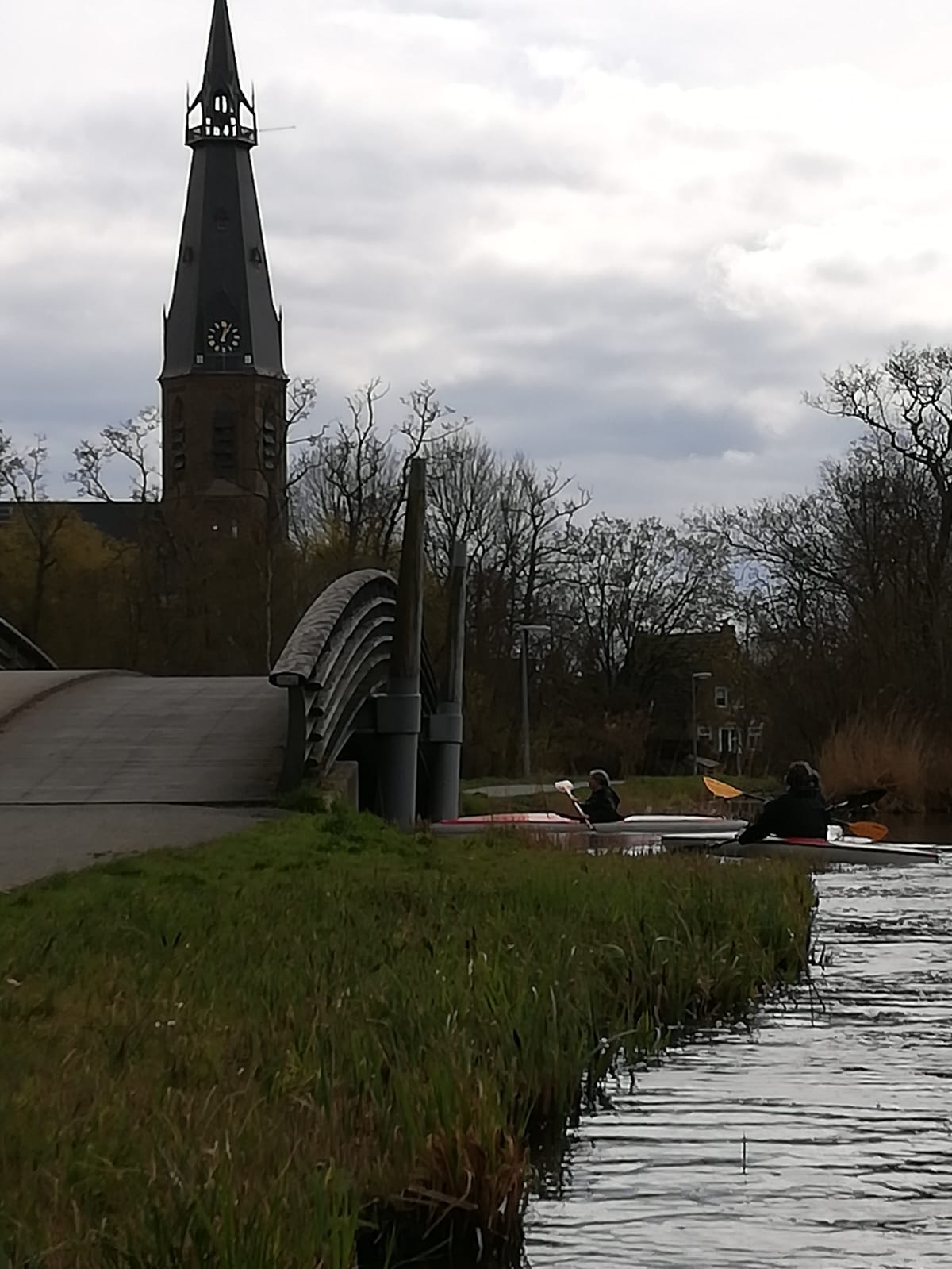 Iedereen de boot in. We starten de route over de rivier Meije met langs de kant boerenland, koeien, schapen en de huizen van het gelijknamige lintdorp. Langzaam komt de watertoren 'Het Potlood' in zicht. Bij een wel erg lage draaibrug stapt Martin soepel uit zijn kajak om de brug te bedienen en verliest daarbij zijn telefoon. iPhone te water! De bodem is liggend op de kant gelukkig net bereikbaar en na wat andere interessante vondsten komt de telefoon boven water. En werkt zelfs nog. We kunnen de tocht dus zonder schade vervolgen.