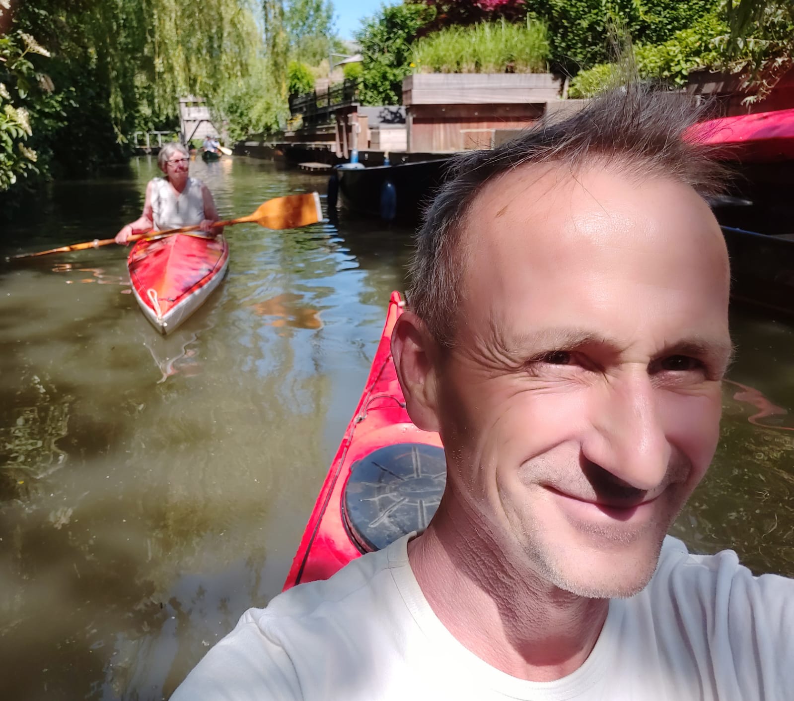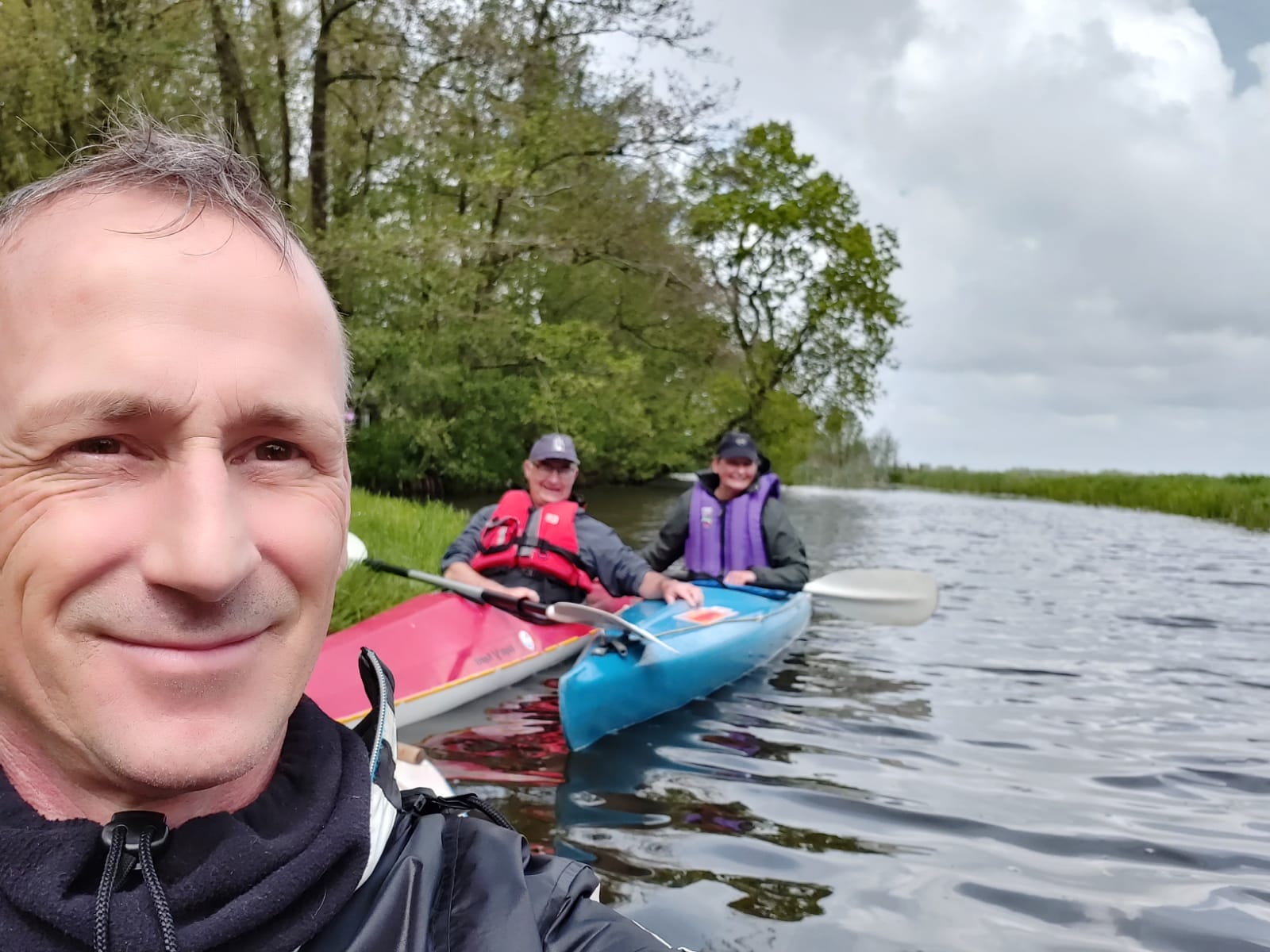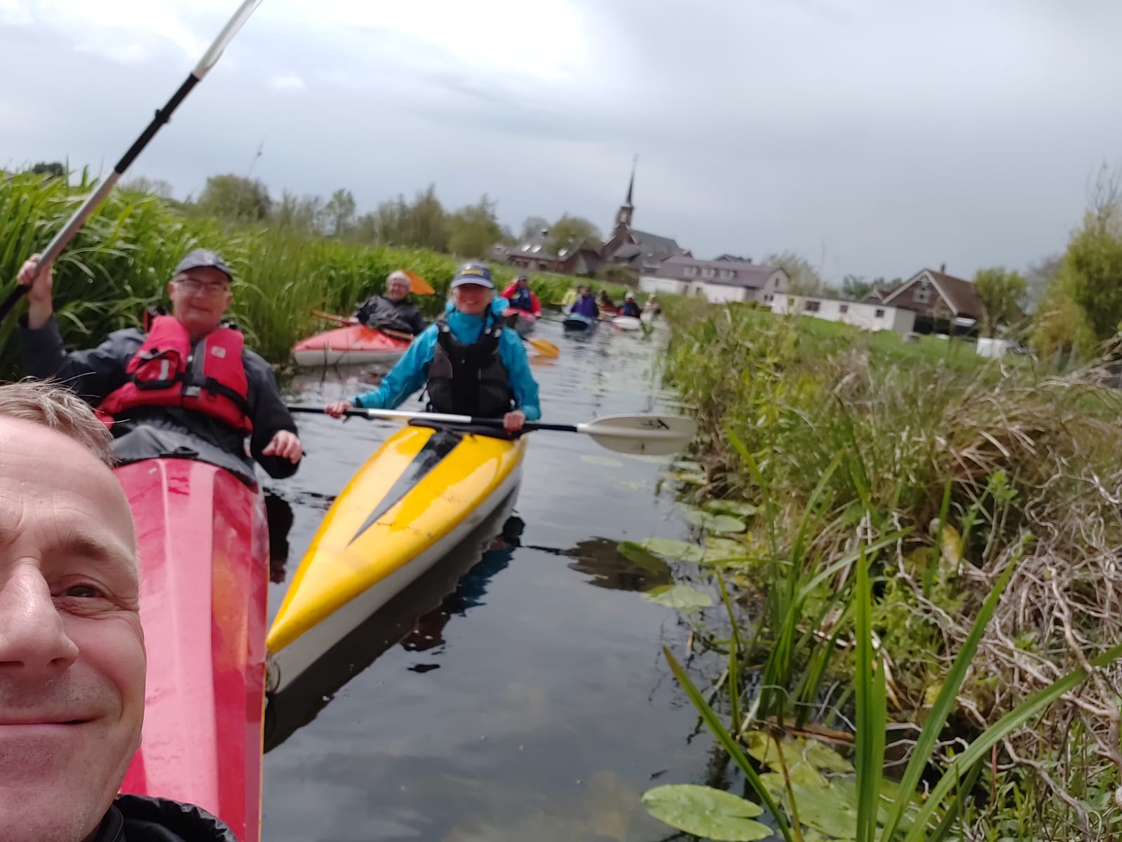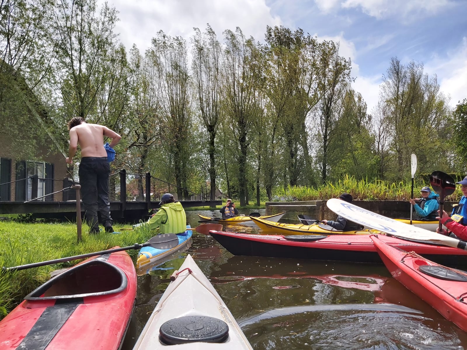 Martin lijkt als toerleider overal te vinden en Koen komt af en toe voorbij met gebruik van bijna iedere kano-houding die voorstelbaar is, zijn kajak hangt af en toe vervaarlijk schuin in het water. We varen rustig verder tot onze tweede stop, midden in de natuur, waar we de veenbodem van dit gebied goed kunnen voelen. We eten onze maaltijd en stroopwafels van Jaap op een verende vloer waar je voeten zachtjes wegzakken in een klein laagje water.