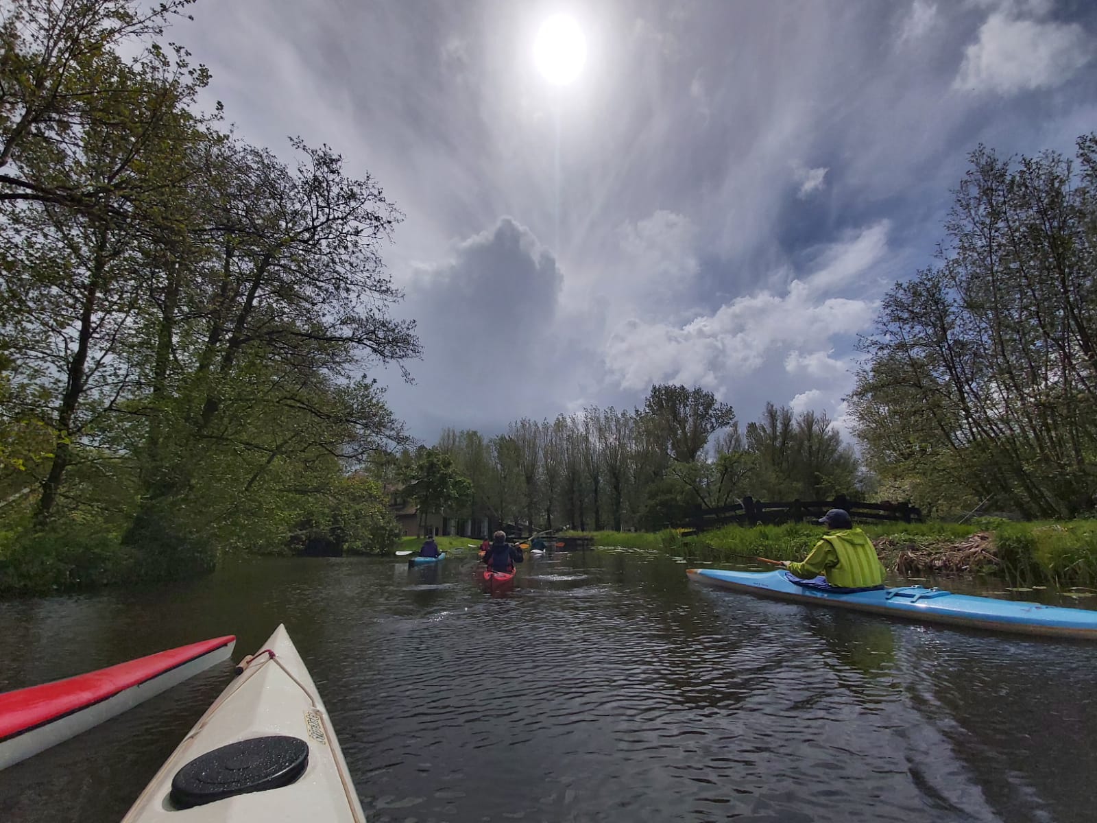 Op een regenachtige zondagochtend druppelen we binnen op de Christoffel Plantijngracht en scharrelen rond op het terrein. Nieuwe leden zoeken boten, peddels en krijgen spatzeilen te leen. Oudgedienden pakken hun vaste spullen uit de loods en leggen alles klaar voor vertrek. Dertien boten worden uiteindelijk op de trailer en het dak van de auto van Martin gehesen. We kunnen op pad!