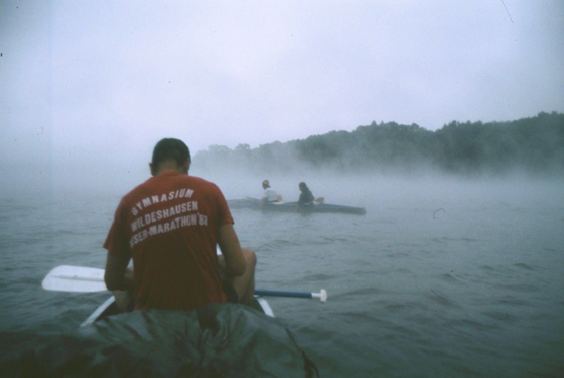 Ondertussen voer de groep babbelend en groetend over het rustige water voort.